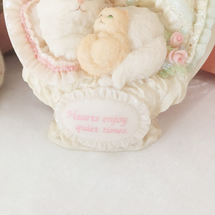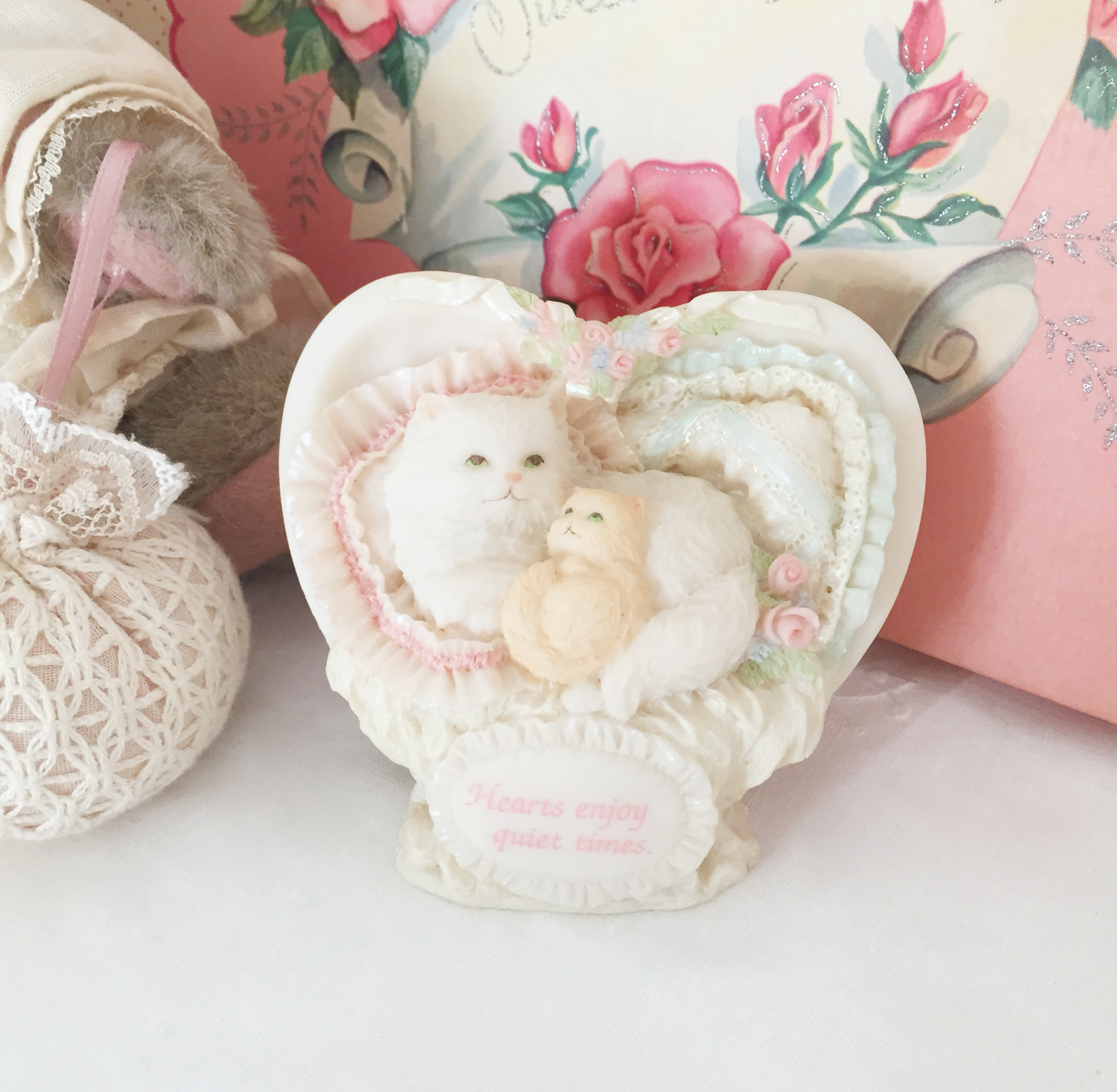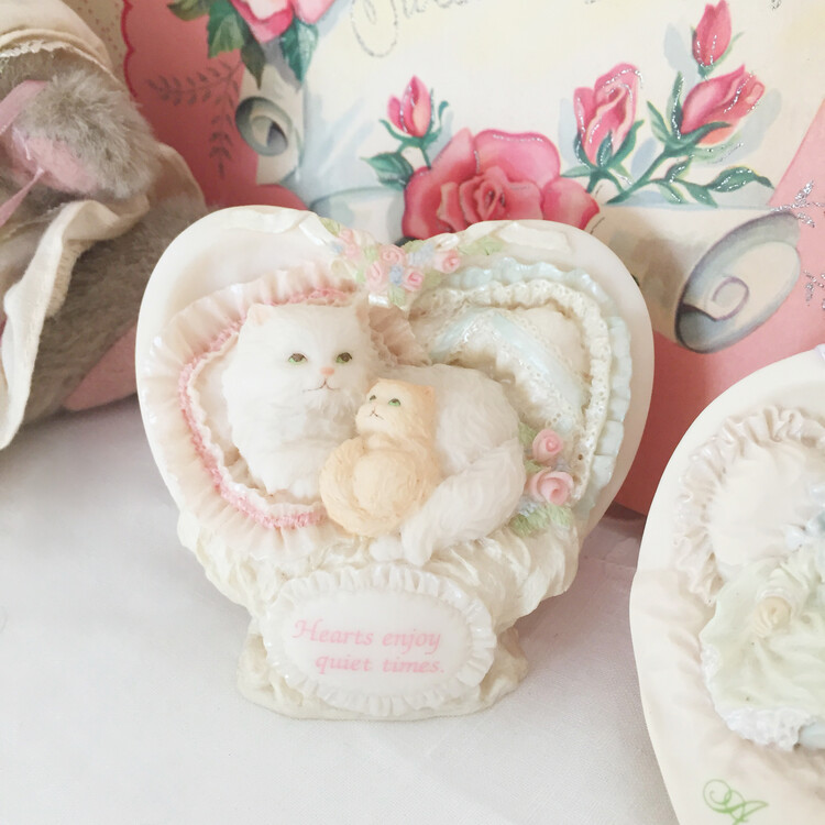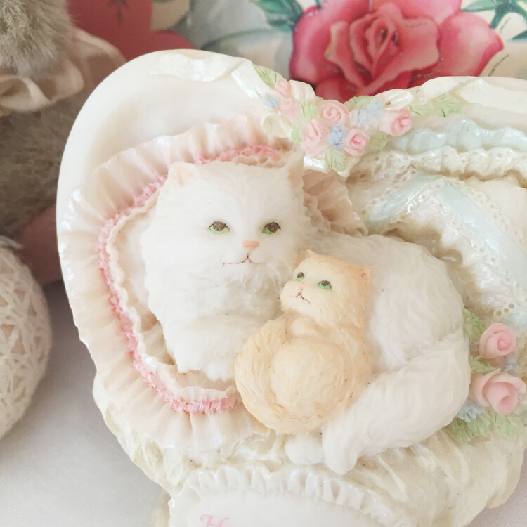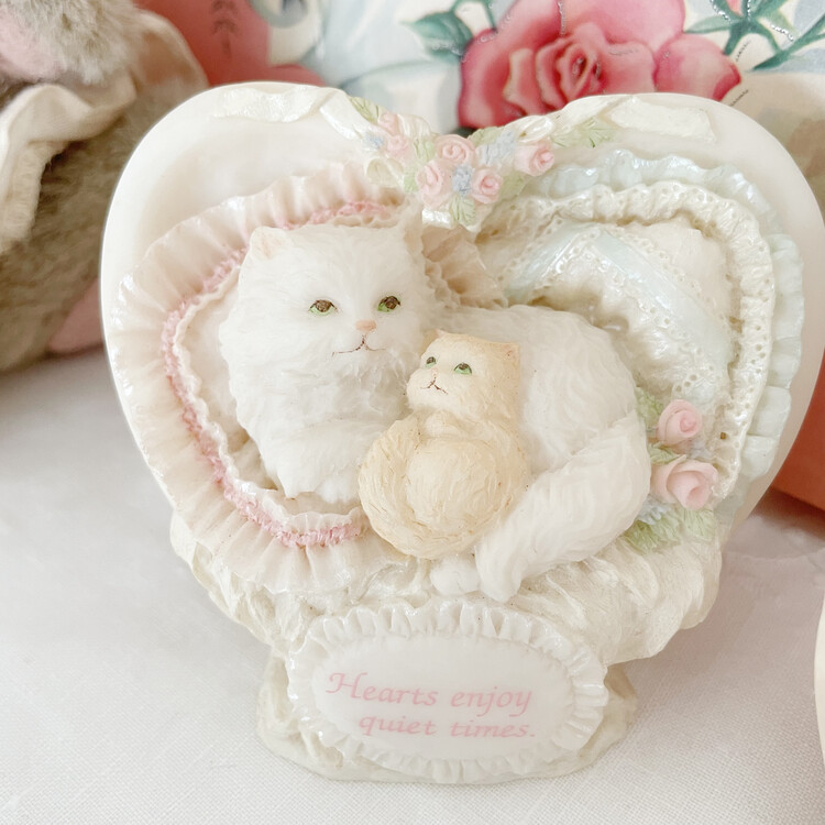 공간에 놓아두기만 해도 따뜻하고 포근한 느낌을 전해줄것 같은 몽글몽글한 색감과 디자인의 하트 피겨린을 소개해드릴게요. 너무나 사랑스러운 하트 모형안에 예쁜 엄마고양이와 아기고양이가 놓여있는 디자인이에요. 하트모형 테두리에 있는 레이스쿠션 디테일이며, 하트에 둘러진 사랑스러운 장미와 리본들이 보면 볼수록 너무나 예쁜 오브제에요. 사진에서 표현되지 않는 은은하게 빛나는 색감과 디테일이 실물로 마주하면 더더 예쁜 제품이라서 이번 기회에 꼬옥 소장하셔서 사랑스러운 공간을 연출해보시길 추천해드릴게요 :)