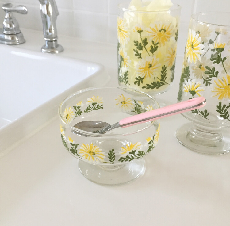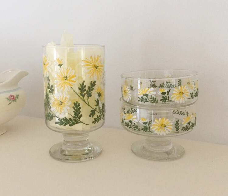 빈티지한 무드의 데이지 플로럴 패턴이 너무나 사랑스러운 고블렛 두가지 타입을 소개해드릴게요. 미국 libbey 사에서 생산된 데이지패턴의 고블렛으로 데이지패턴이 엠보싱의 형태로 이루어져있어 입체적으로 꽃이 새겨져있는 쉐입이에요. 두가지 타입 모두 쉽게 만나보기 힘든 레어한 제품으로 이번기회에 꼬옥 소장하시길 추천해드릴게요 :)