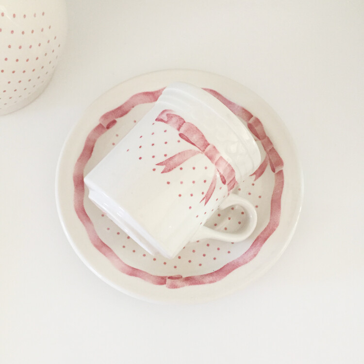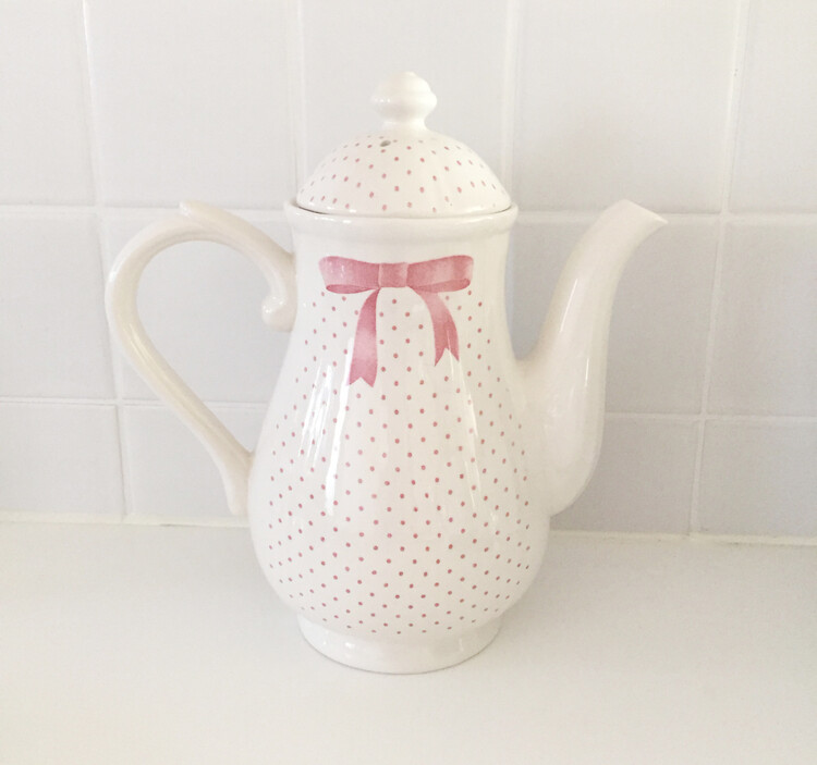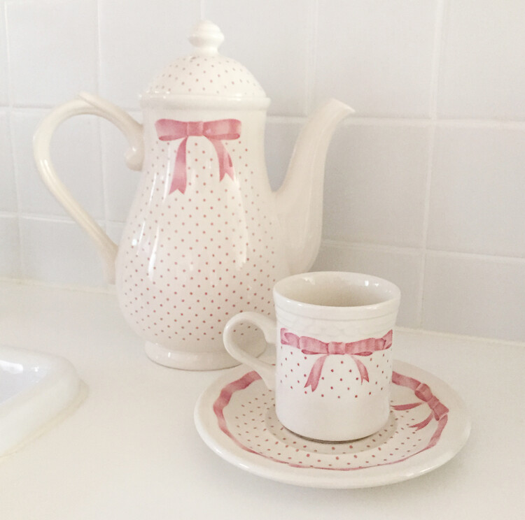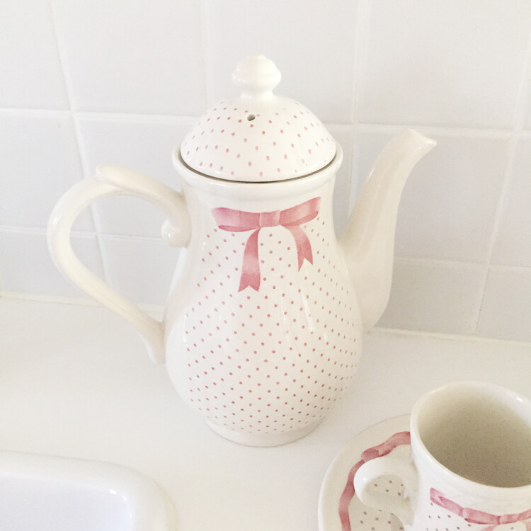 너무나 사랑스러운 핑크리본을 두른 컵앤소서와 티팟을 소개해드릴게요. 영국에서 생산된 제품으로 톤다운된 옅은 핑크색감과 사랑스러운 쉐입의 리본, 도트가 만나 너무나 예쁜 제품이에요. 이 제품은 특히나 쉽게 만나보기 힘든 레어 빈티지 제품으로 이번기회에 꼬옥 소장하셔서 사랑스러운 홈카페를 연출해보시길 추천해드릴게요 :)
