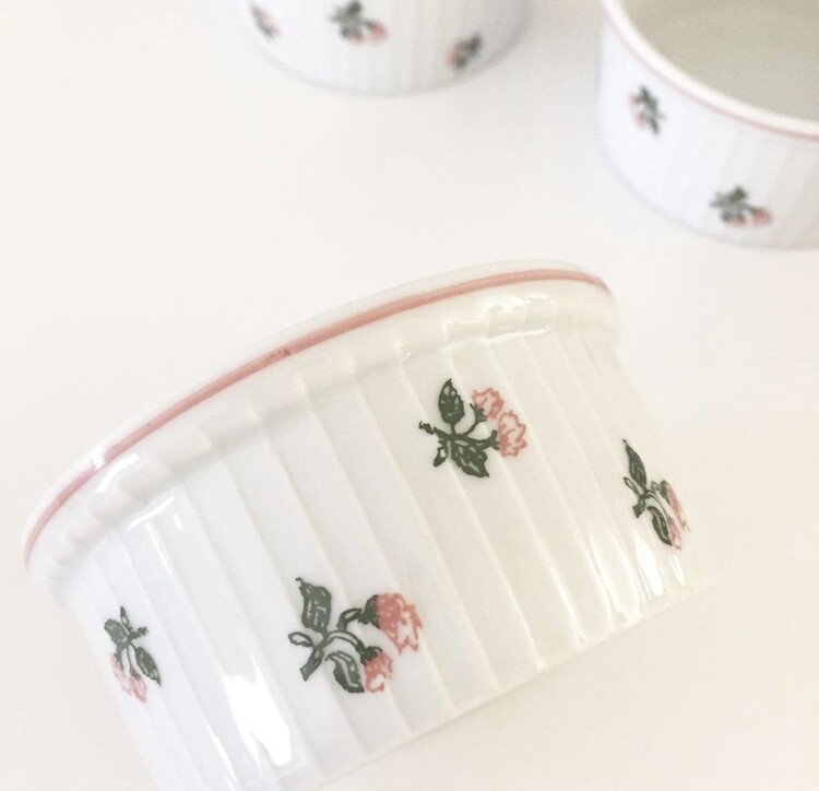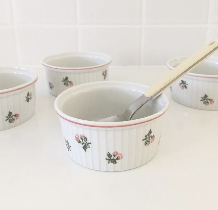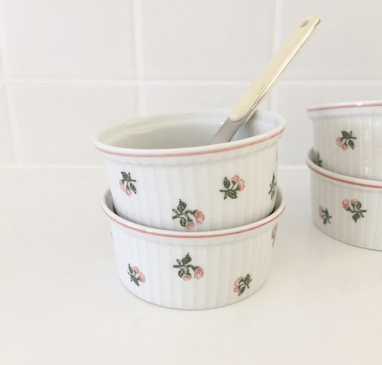 1960년대에 프랑스에서 생산된 빈티지한 무드를 가득 담고있는 로즈 플로럴 라메킨을 소개해드릴게요. 개인적으로 빈티지 라메킨 제품을 특히나 애정하는데 작은 사이즈의 아담한 보울로 소스, 버터, 잼 또는 작은 디저트를 담아내기에 너무나 예쁘고 사랑스러운 제품이에요. 쉽게 만나보기 힘든 소장가치 높은 레어빈티지 제품으로 이번 기회에 꼬옥 소장하셔서 사랑스러운 홈카페를 연출해보시길 추천해드릴게요 :)