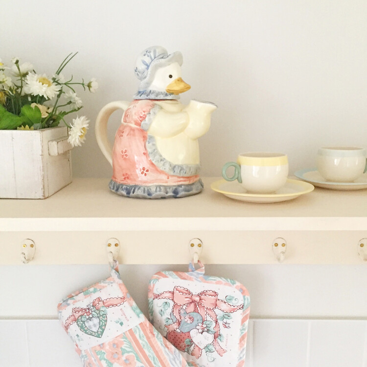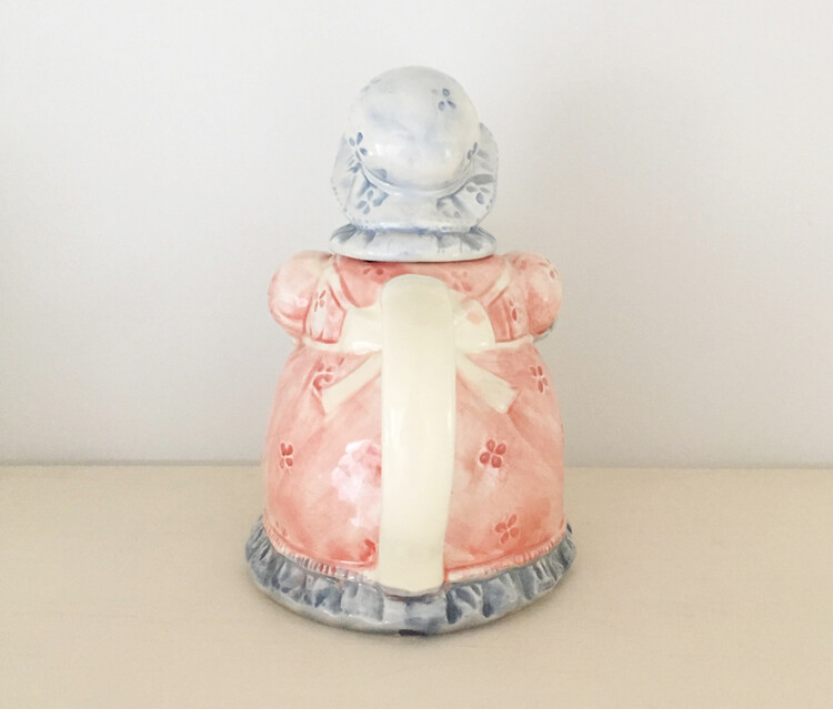 너무나 사랑스럽고 귀여운 쉐입의 구스 티팟을 소개해드릴게요. 개인적으로 늘 예쁜 쉐입의 구스티팟을 소개해드리고 싶었는데 너무너무 마음에 쏙 드는 제품으로 소개드리게되었어요! 전체적으로 베이비블루톤의 색감과 코랄색감이 예쁘게 어우러져있고 레이스프릴 패턴의 원피스와 에이프런이 너무나 사랑스러운 아이에요. 빈티지한 주방무드에 장식해 놓기만해도 너무너무 예쁠것 같아요. 크게 눈에 띄는 스크래치나 프린팅소실은 없는 깨끗한 컨디션으로 이번 기회에 꼬옥 소장하셔서 사랑스러운 홈카페를 연출해보시길 추천해드릴게요 :)